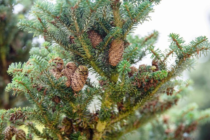 Also known as red or white fir, the noble fir is a popular choice for Christmas trees. Distinct tiers of branches with open spaces allow you to showcase ornaments while avoiding the appearance of bare spots. Noble firs show attractive, smooth, silvery-gray bark with 1-inch gray-green or bright blue-gray leaves. The cones are 5 to 10 inches long and are purple-brown when ripe.