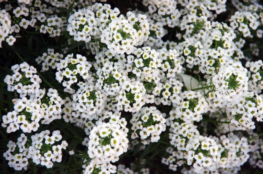 Sweet alyssum (Lobularia maritima) needs a few hours of sun a day but does best when it’s protected from the heat of afternoon sun in a partial shade garden. These darling white blooms form a carpet of color in the cool of early spring, then the flowers pop up again when the temperatures drop in fall. Note that sweet alyssum is considered invasive in various parts of the country but mostly in parts of California.