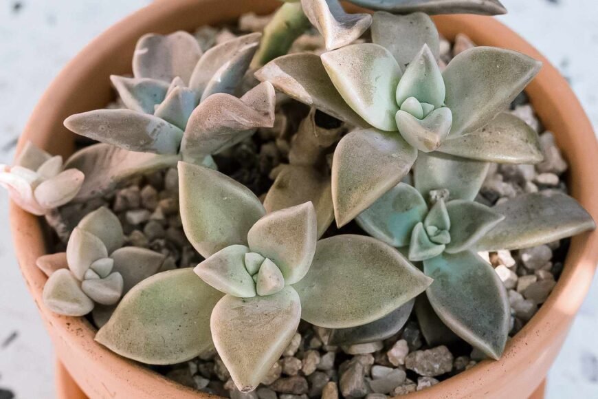 Ghost plants are slow-growing and don’t need frequent repotting. When your specimen has outgrown its container, be sure to handle the plant carefully to avoid damaging the powdery pruinose coating on the leaves, which is delicate. Grasp plants at the base of the crown rather than by the leaves, and repot it in a light potting mix or cactus mix.