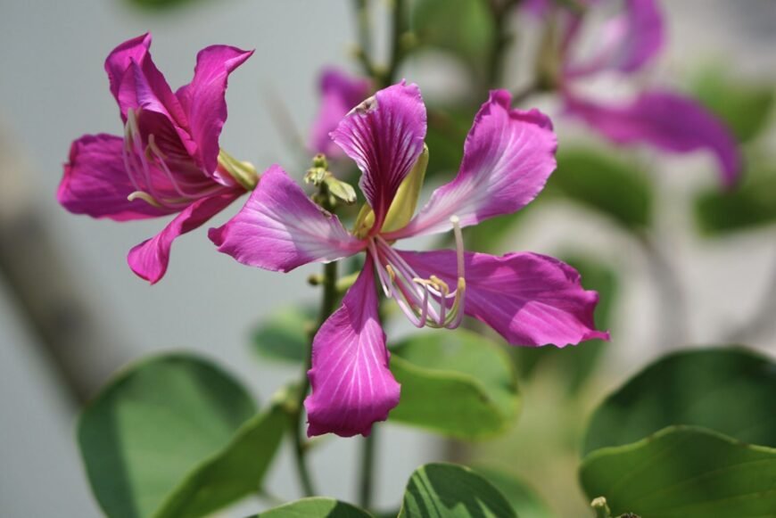 With its dramatic foliage and long-blooming colorful flowers, the Hong Kong orchid tree (Bauhinia × blakeana) makes a very striking specimen planting in warm, arid climates. Though it is not a true orchid, the shape and rich colors of the flowers are reminiscent of orchids. The tree was first discovered by French missionaries on the western coast of Hong Kong and is the official tree of the island. These beautiful tropical trees are often referred to as evergreens, but in truth they’re deciduous and drop their leaves in late winter before forming spring buds. They have large butterfly-shaped leaves, and produce large, delicate-looking but sturdy blooms in shades of purple and rose pink, sometimes with some white variegation. At 6 inches across, the blooms are twice the size of other orchid tree flowers. The flowers of the Hong Kong orchid tree last from November through the end of March, at a time when there aren’t many trees flowering in the winter landscape.