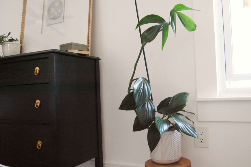 This plant has a climbing growth habit, so it is recommended that you provide it with some type of support to climb as it matures. You can use a moss pole, or something a little simpler such as a trellis or a large stick or bamboo support. While these tropical climbers can technically grow without a moss pole or support, they will never reach full maturity unless they are given something to climb.