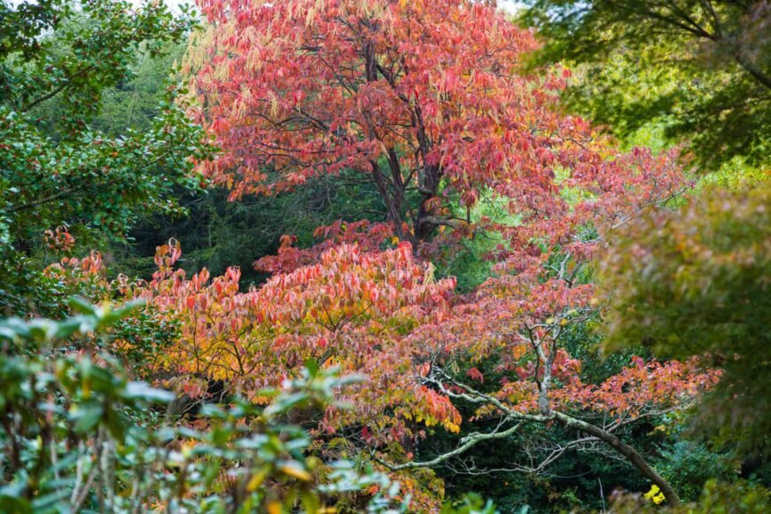 • Oxydendrum arboreum ‘Chameleon’: Colorful fall foliage display. Displays shades of red, purple, and yellow in fall. Upright habit.