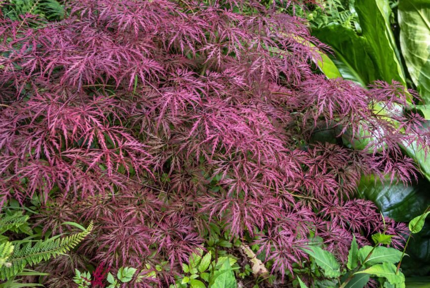 - ‘Red Dragon’ (Acer palmatum dissectum ‘Red Dragon’) can grow as tall as 8 feet in height and has reddish-purple foliage that changes into a crimson red. It is a good container or patio tree.